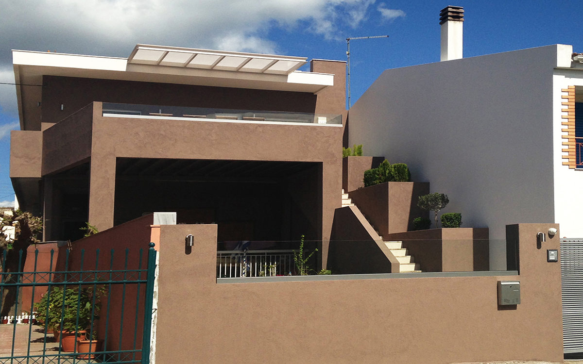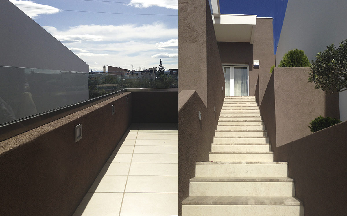 Η μελέτη και κατασκευή του έργου περιέλαβε την διαμόρφωση των εξωτερικών και υπαίθριων χώρων της κατοικίας. Συγκεκριμένα έγινε προσθήκη μεταλλικού παταριού για την αύξηση του εμβαδού εξώστη του ορόφου με παράλληλη δημιουργία ημιυπαίθριου χώρου στο ισόγειο.