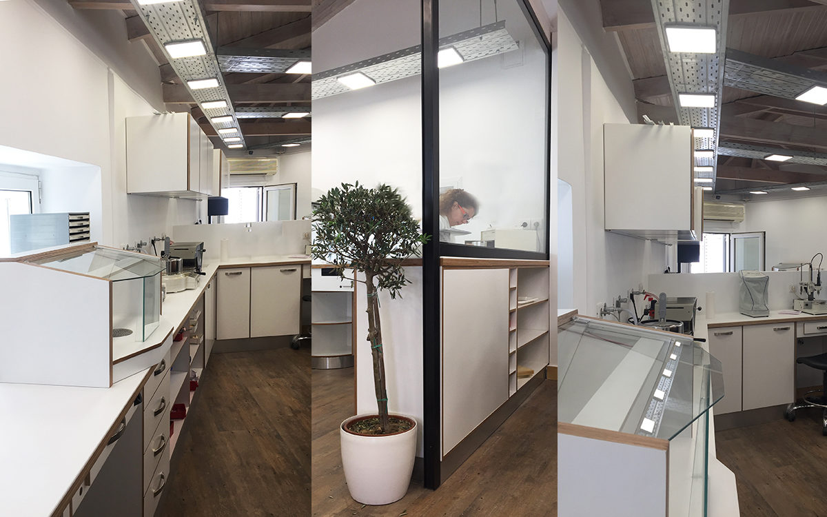 Το απαιτητικό παράγωνο σχήμα του χώρου χρειάστηκε τον σχεδιασμό του συνόλου της επίπλωσης ώστε να εξυπηρετεί την εξειδικευμένη λειτουργία του εργαστηρίου.