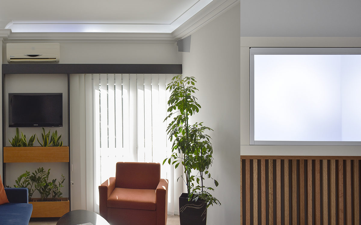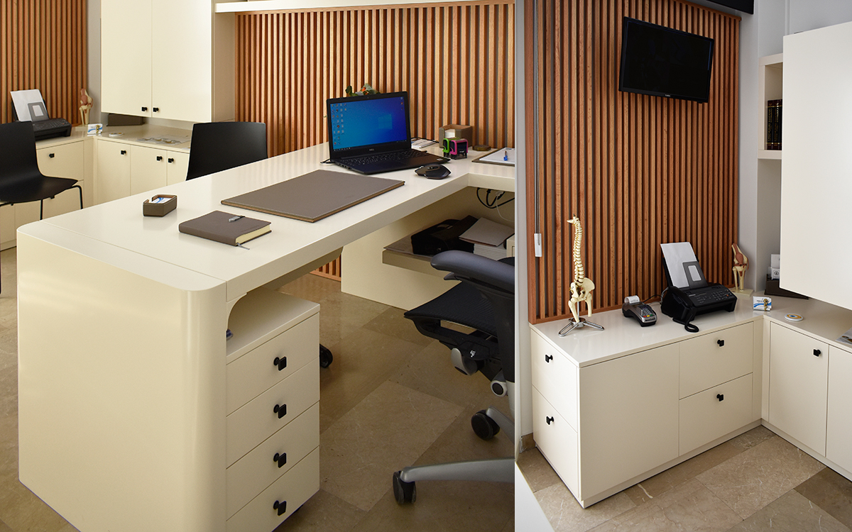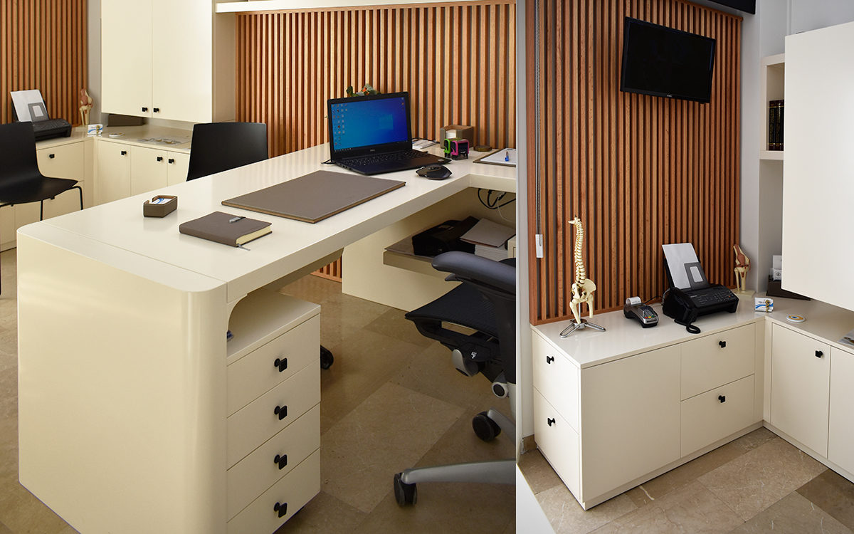 Σχεδιάστηκε το σύνολο των ξύλινων επίπλων που αποτέλεσαν ειδικές παραγγελίες και αλλάχθηκαν οι ταπετσαρίες στα έπιπλα του καθιστικού. Το αποτέλεσμα είναι ένας ευχάριστος χώρος ιδιαίτερης αισθητικής πάνω στις ανάγκες του επαγγελματία.