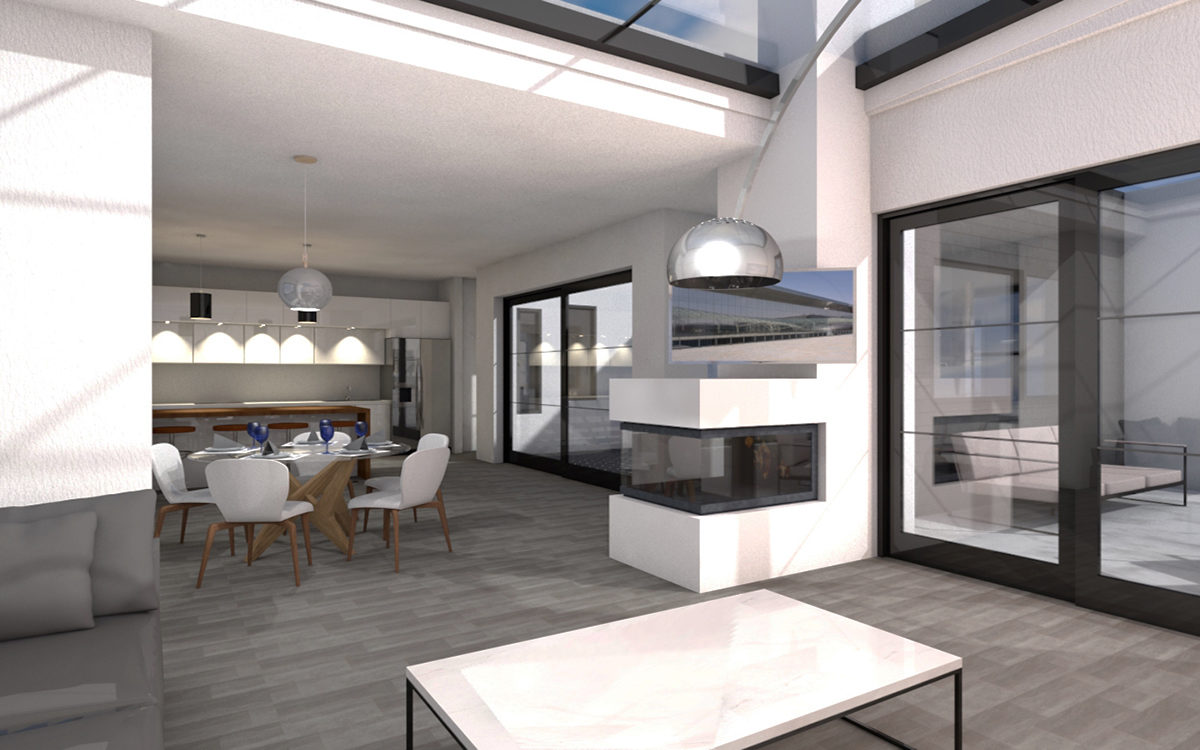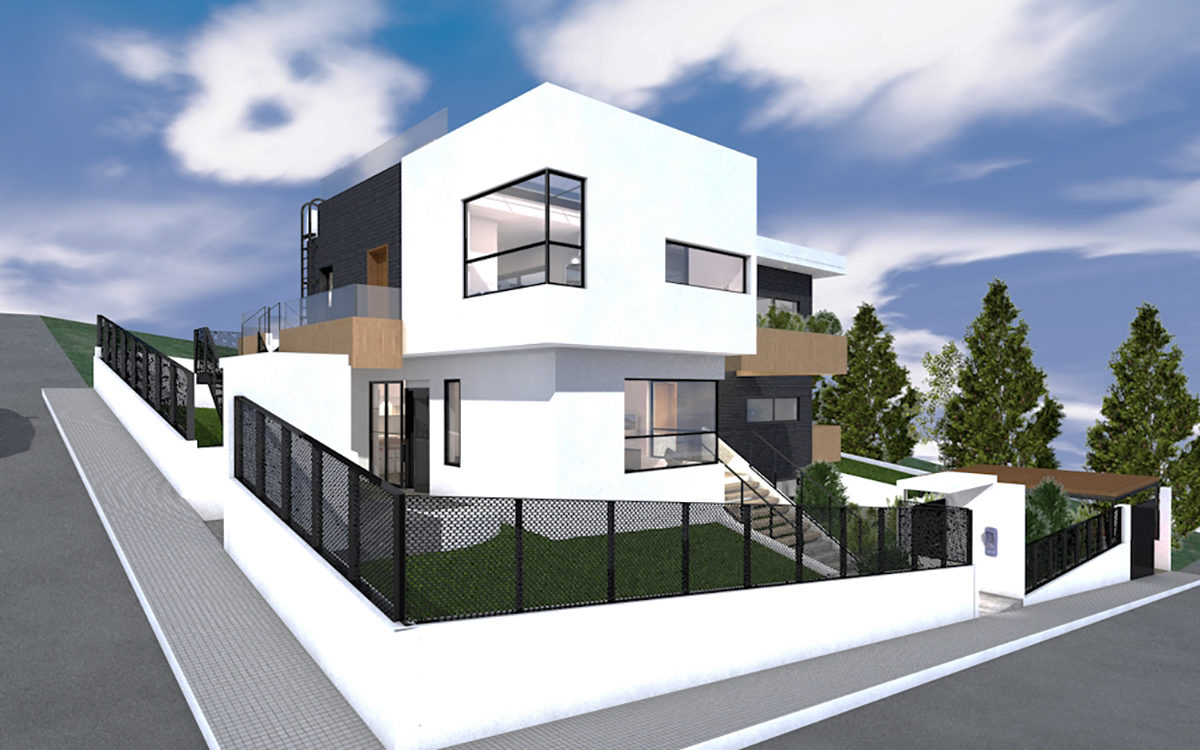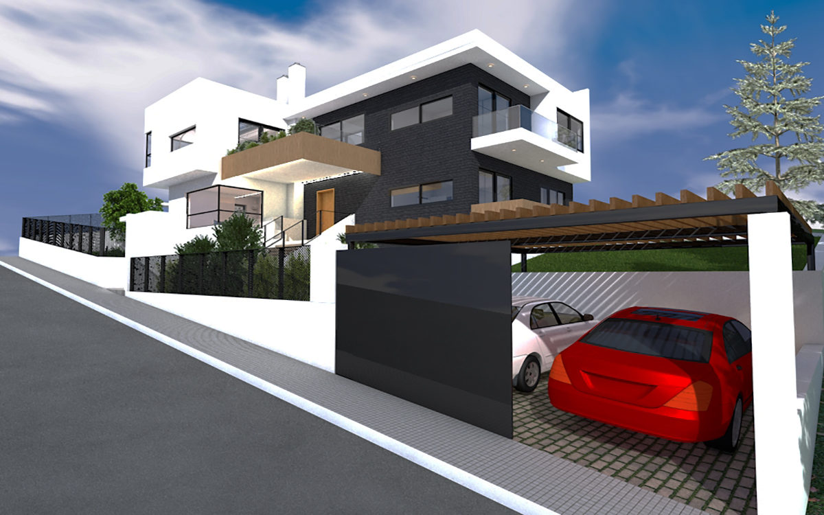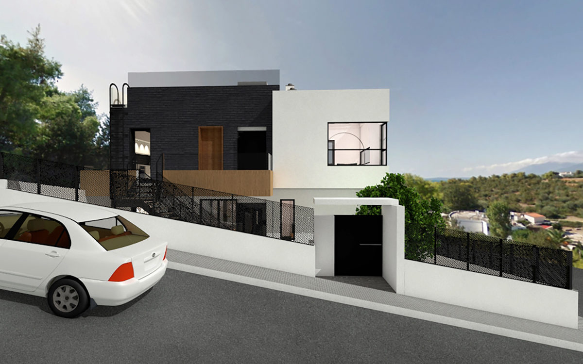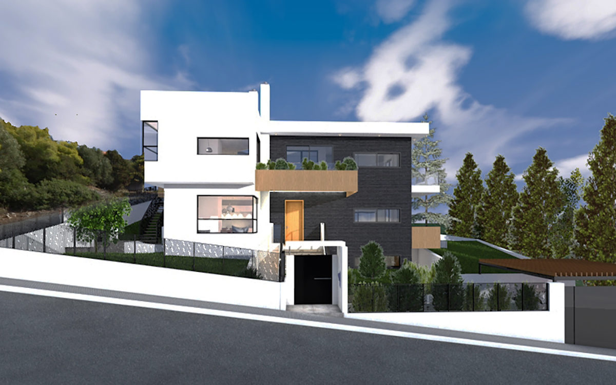 Το κτήριο σχεδιάστηκε και κατασκευάζεται για μια εκτεταμένη οικογένεια τριών γενεών. Ενώ φέρει ενιαίο χειρισμό λειτουργικά στέκεται και ως δύο αυτόνομες κατοικίες. Οργανώνεται με ογκοπλαστικό ενδιαφέρον ακολουθώντας καθ’ ύψος την απότομη κλίση του εδάφους. Στον σχεδιασμό έχει ενσωματωθεί ένα εσωτερικό αίθριο με σκοπό τον καλύτερο αερισμό και ηλιασμό του συνόλου της κατοικίας και χάρη στη βιοκλιματική του συμπεριφορά δημιουργεί ένα ευχάριστο μικρόκλιμα. Από άποψη υλικότητας ο ένας όγκος επενδύεται με τοπική πέτρα. Στις 5 όψεις (συμπεριλαμβανομένης της άνοψης) έγινε γενναίος χειρισμός των ανοιγμάτων με χαρακτηριστικά γωνιακά παράθυρα και γυάλινη οροφή στο καθιστικό.